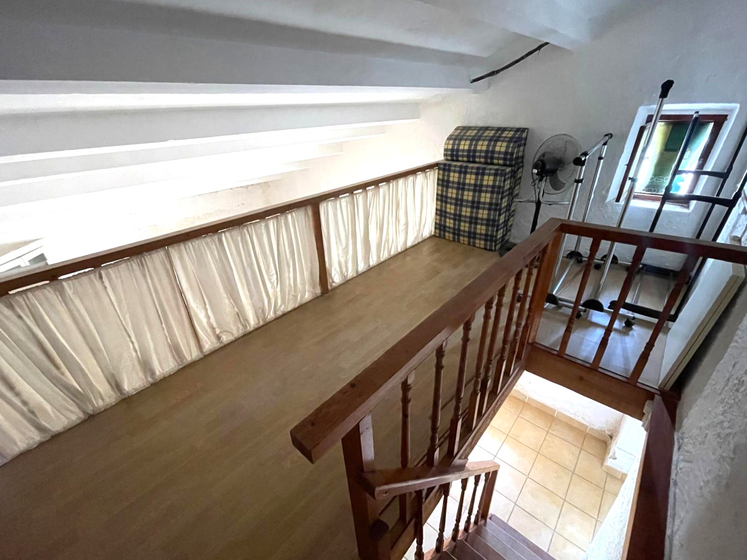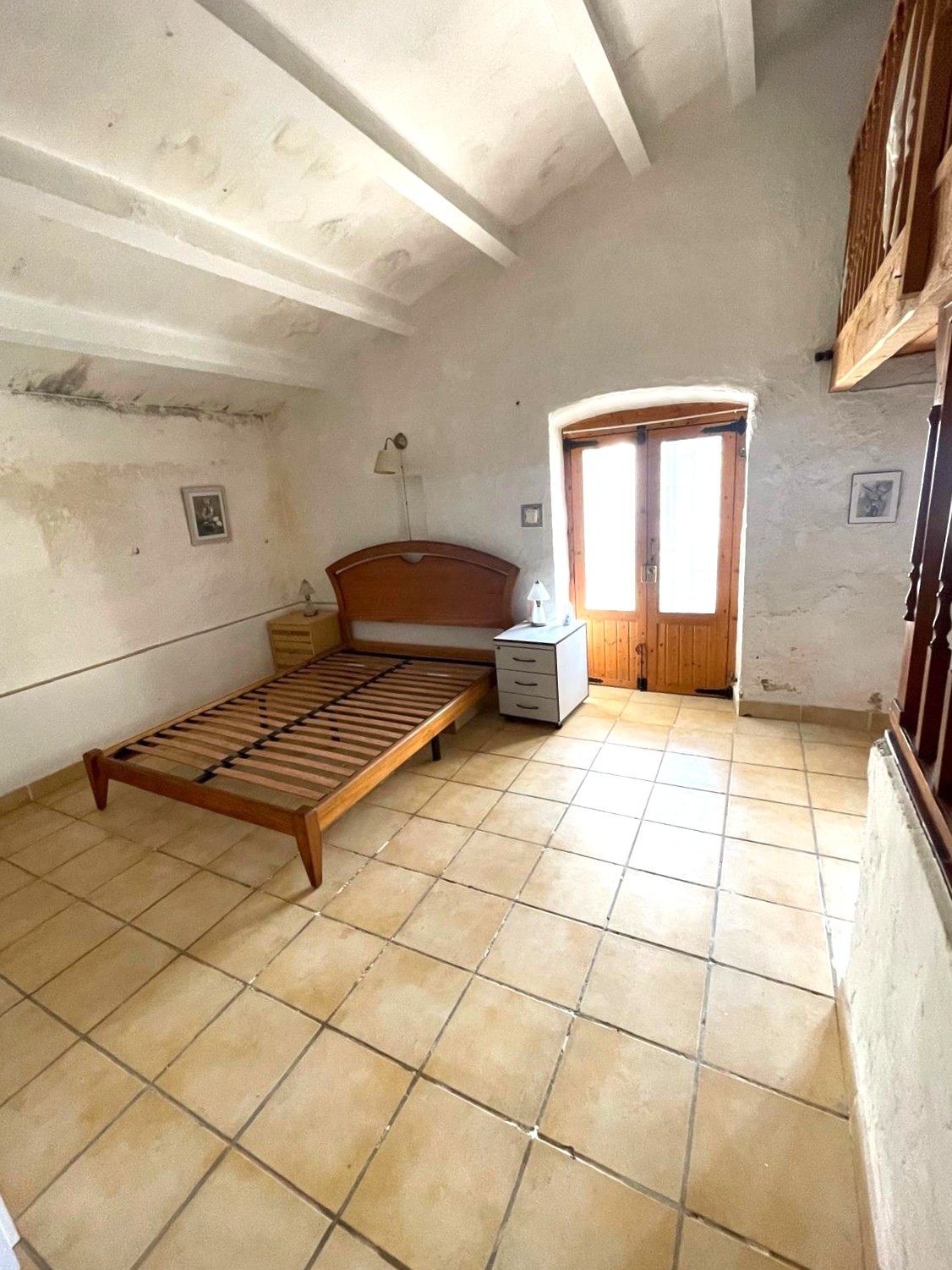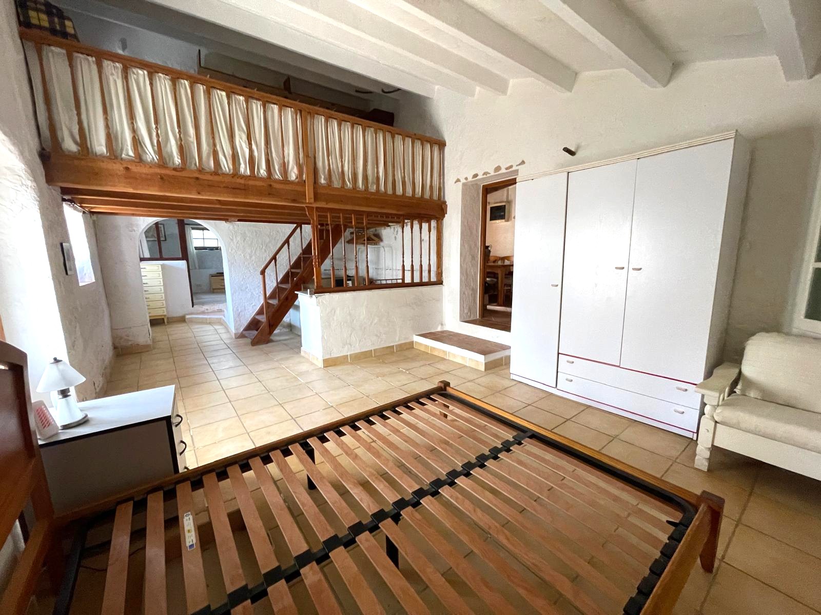 - A large main bedroom featuring wooden stairs to a versatile mezzanine level